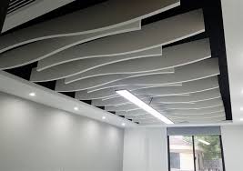 Acoustibuilt seamless acoustical ceiling system. Acoustic ceiling panels serve as barriers to block sound from traveling to adjacent rooms and also as a means to reduce the noise within a room. Hanging acoustic baffles are 2 sided acoustical panels suspended perpendicular to the ceiling.