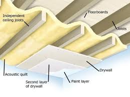 Rockwool stone wool insulation is an ideal material to be used in interior ceiling floor partitions where sound absorbency and fire resistance is required. Acoustic insulation acoustic insulation or sound proofing prevents the escape of sound waves from aroom or sound transmission from room to room in a house. To improve or soundproof an ordinary drywall ceiling you can fill the ceiling space with a suitable insulating or sound absorbent material such as fiberglass.