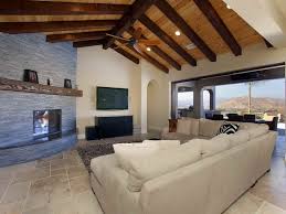 Exposed beam logs run the length of the massive vaulted ceiling matching the walls for texture and tone. One of the benefits of adding exposed ceiling beams to your living room is that you can get creative with design and have control over how it looks it s harder to change beams that are already built in. To add drama and airiness to any room consider exposed ceiling beams overhead.